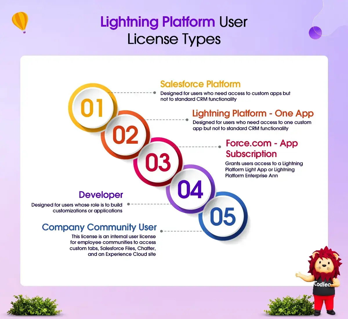 If you want a licensing structure that fits your budget, hire Codleo, a certified Salesforce consultant. We can help you reduce your Salesforce license costs and improve usage. With over 10 years of experience, we know the best ways to optimize your Salesforce license use.